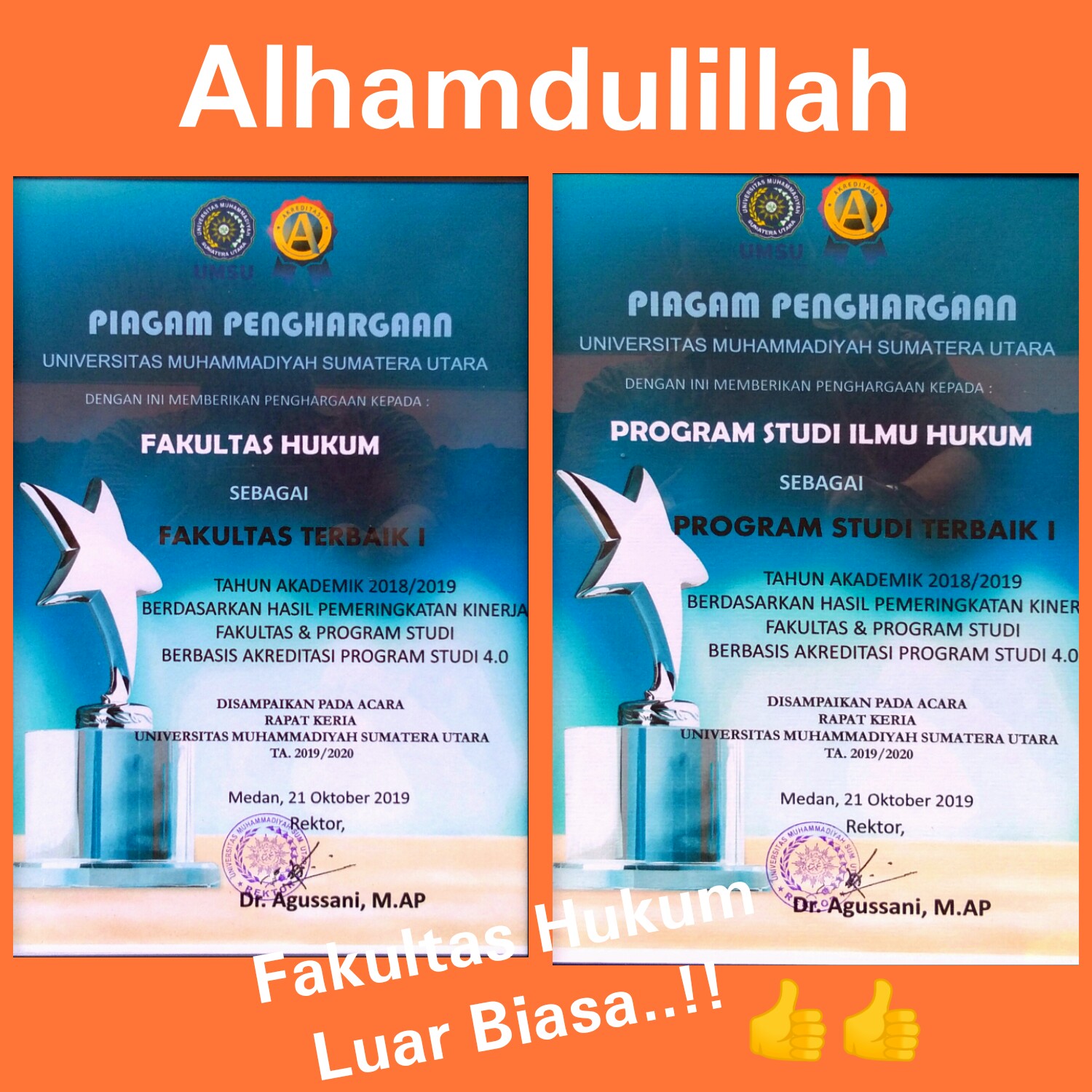 PREDIKAT: 1. FAKULTAS TERBAIK I, 2. PROGRAM STUDI TERBAIK I, DI LINGKUNGAN UNIVERSITAS MUHAMMADIYAH SUMATERA UTARA (UMSU) TAHUN AKADEMIK 2018/2019. DIBERIKAN OLEH REKTOR UMSU, Dr.Agussani, M.AP. DI AULA UMSU MEDAN, 21 Oktober 2019.