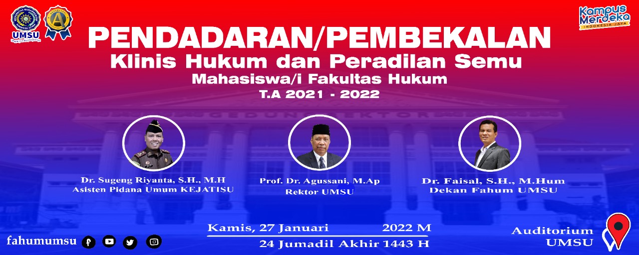 Ditengah maraknya kasus kejahatan yang terjadi di Sumatera Utara, menyebabkan banyak nya jumlah kasus yang ditangani oleh Kejaksaan di pengadilan, “ujar Sugeng Riyanta saat memberikan pembekalan dalam acara “Pendadaran Mahasiswa peserta Klinis Hukum dan Peradilan Semu Fakultas Hukum UMSU 2021-2022” di Aula Kampus Utama UMSU,Jalan Kapten Mukhtar Basri Medan, Kamis (27/1/2022)