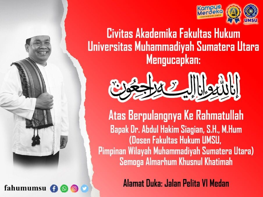Atas berpulangngnya ke rahmatullah *Bapak Dr. ABDUL HAKIM SIAGIAN SH., MHum* (Dosen Fakultas Hukum UMSU, Wakil Ketua Pimpinan Wilayah Muhammadiyah Sumatera Utara)”