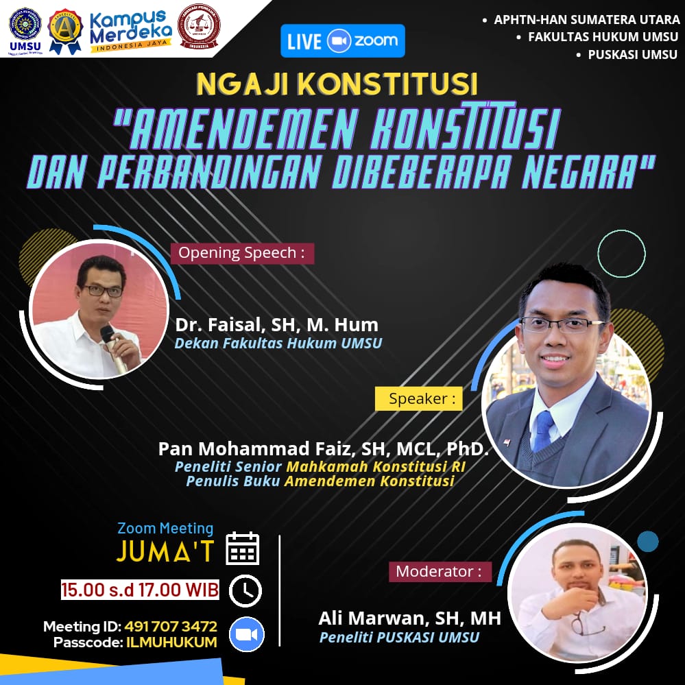 Dekan Fakultas Hukum UMSU (Dr. Faisal, SH, M. Hum) memberikan opening speech pada webinar ngaji konstitusi “Amendemen Konstituai dan Perbandingan di Beberapa Negara”