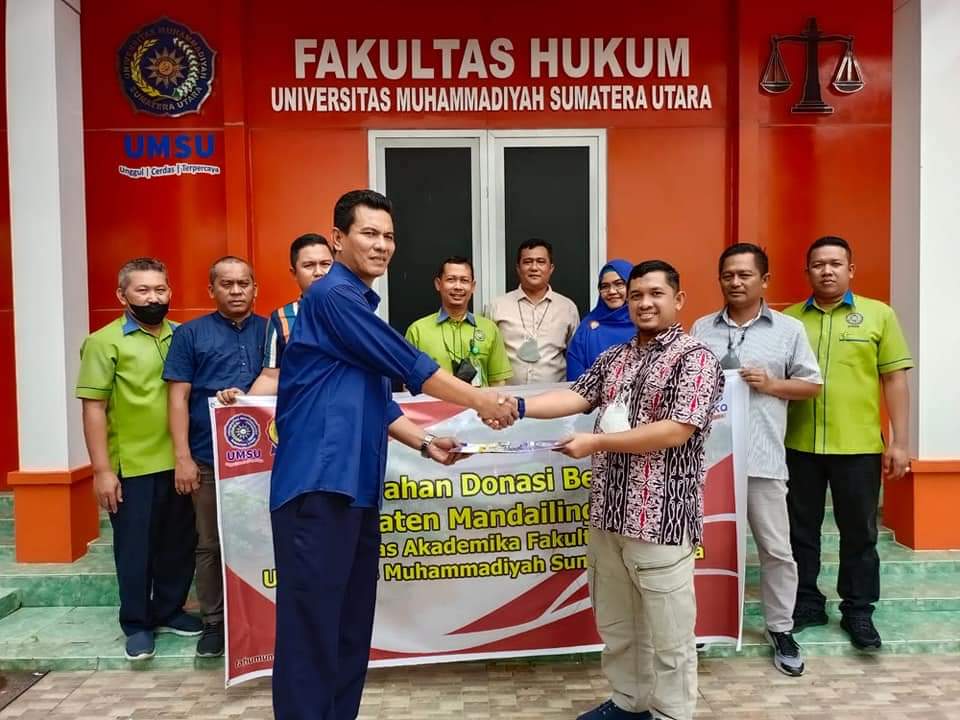 Menyerahkan bantuan yang telah dikumpulkan dari civitas akademika Fakultas Hukum UMSU melalui Ketua Pimpinan Wilayah Pemuda Muhammadiyah Sumatera Utara (Amrizal) untuk diserahkan langsung kepada korban Bencana Mandailing Natal