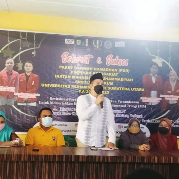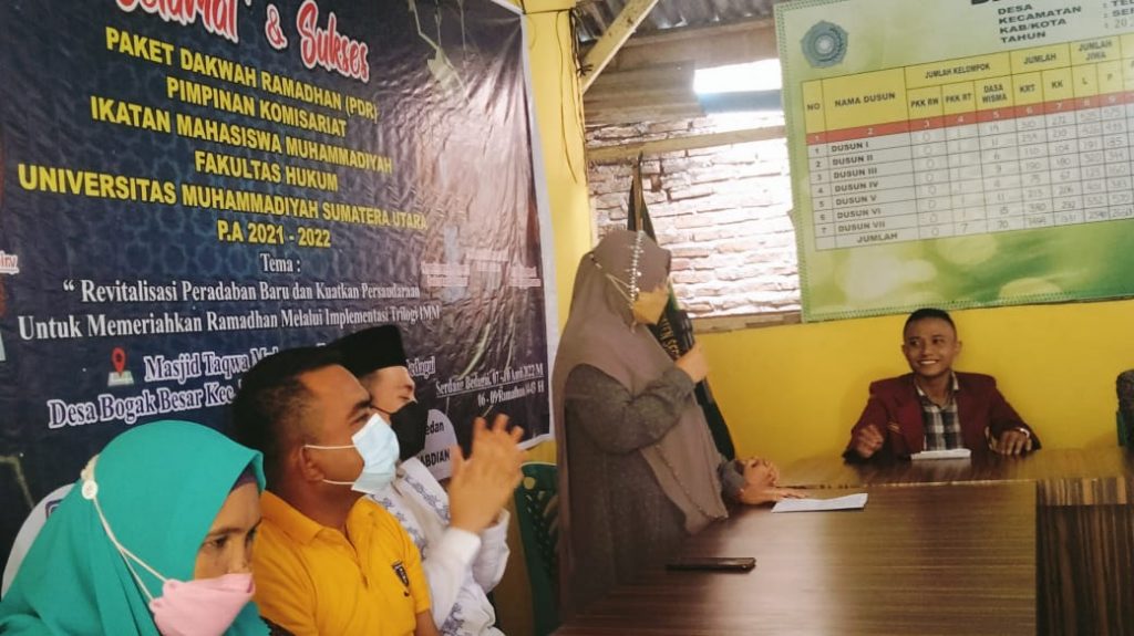 Pimpinan Komisariat Ikatan Mahasiswa Muhammadiyah Fakultas Hukum UMSU melaksanakan Kegiatan Paket Dakwah Ramadhan (PDR) dengan tema “Revitalisasi Peradaban Baru Dan Kuatkan Persaudaraan Untuk Memeriahkan Ramadhan Melalui Implementasi Trilogi IMM” yang dilaksanakan pada hari Kamis 07, April 2022 Hingga Minggu, 10 April 2022 bertempat di Dusun IV Desa Bogak Besar Kec. Teluk Mengkudu Kab. Serdang Bedagai.