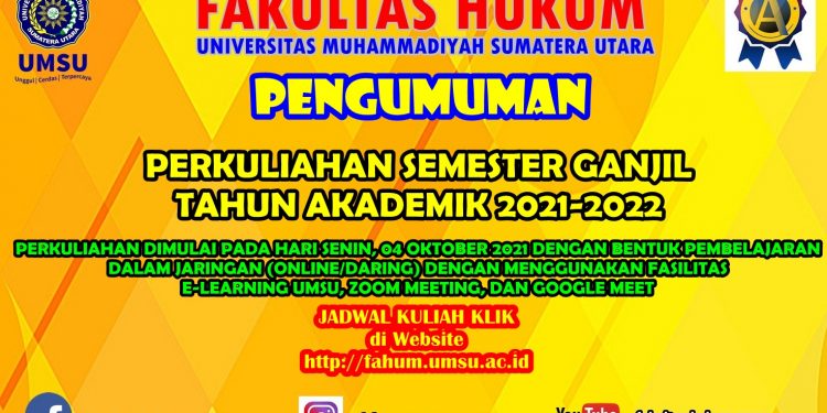 JADWAL PERKULIAHAN FAKULTAS HUKUM UMSU SEMESTER GANJIL TAHUN AKADEMIK 2021-2022, PERKULIAHAN DIMULAI PADA HARI SENIN, 04 OKTOBER 2021 DENGAN BENTUK PEMBELAJARAN DALAM JARINGAN (DARING/ONLINE), DENGAN MENGGUNAKAN FASILITAS: E-LEARNING UMSU, ZOOM MEETING DAN GOOGLE MEET.