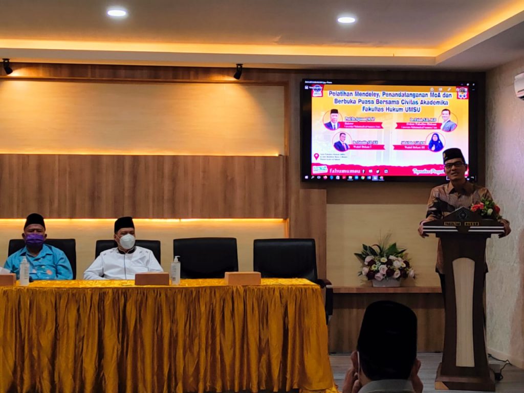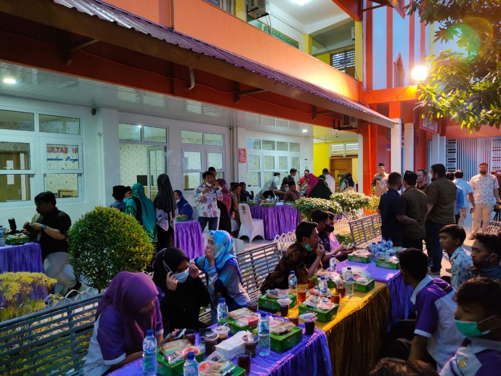 Diawali sambutan oleh Dekan Fakultas Hukum UMSU Bapak Dr. Faisal S.H., M.Hum menyampaikan terima kasih kepada para hadirin yang sudah mau berhadir dalam acara buka puasa, dan menyinggung sedikit permohonan kepada Rektor untuk meminta Pimpinan Pusat yang akan hadir pada sabtu 23/4/22 dalam rangka meresmikan Aula Baru Fakultas Hukum UMSU, sedangkan sambutan Oleh Rektor sedikit menyampaikan bahwa Kegiatan Buka Puasa Bersama oleh Fakultas Hukum merupakan, kegiatan Buka Puasa ketiga di lingkungan Universitas Muhammadiyah Sumatera Utara. Seperti halnya acara Buka Puasa pada umumnya Fakultas hukum juga mengundang bapak Drs. Mahmud Yunus Daulay M.A sebagai penceramah dengan materi ceramah 5 tingkatan orang yang bertaqwa dalam Islam, diantaranya Muslim, Mukmin, Mukhsin, Mukhlis dan Muttaqin. Dan di akhiri dengan Buka Puasa Bersama yang telah disediakan dengan cara kekeluargaan sebab selain dosen, turut pula keluarga besar fakultas hukum berhadir dalam acara tersebut. (21/4/2022)