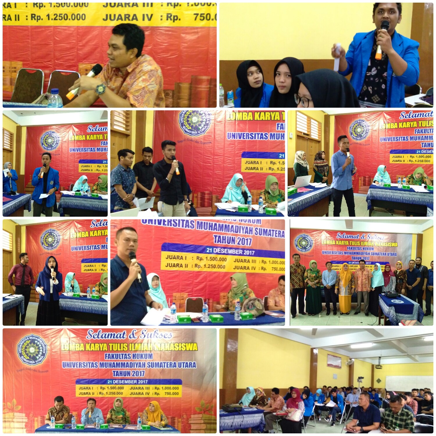 Turut hadir juga Dewan Juri Lomba Karya Tulis Ilmiah: 1. Prof. Alesyanti, SH., M.Pd, 2. Dr. Adi Mansar, SH., M. Hum, 3. Nursariani Simatupang, SH., M. Hum. Sebagai Pembawa Acara Taufik Hidayat, SH., MH dan sebagai Moderator Rahmat Ramadhani, SH., MH. Peserta Lomba terdiri dari 11 Kelompok yang terdiri dari Mahasiswa Fakultas Hukum UMSU. di Ruang 203 Lt. II Gedung Fakultas Hukum UMSU Jl. Kapten Muchtar Basri No. 3 Medan. Kamis, 21/12/2017.