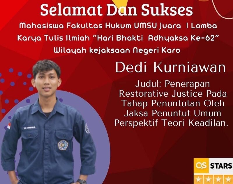 Dedi Kurniawan merupakan mahasiswa semester IV Fakultas Hukum UMSU berhasil meraih Juara I Lomba Karya Tulis Ilmiah Tingkat Nasional yang diikuti oleh beberapa universitas di Indonesia. Perlombaan ini merupakan rangkaian dari acara Dirgahayu Kejaksaan Republik Indonesia. (*)