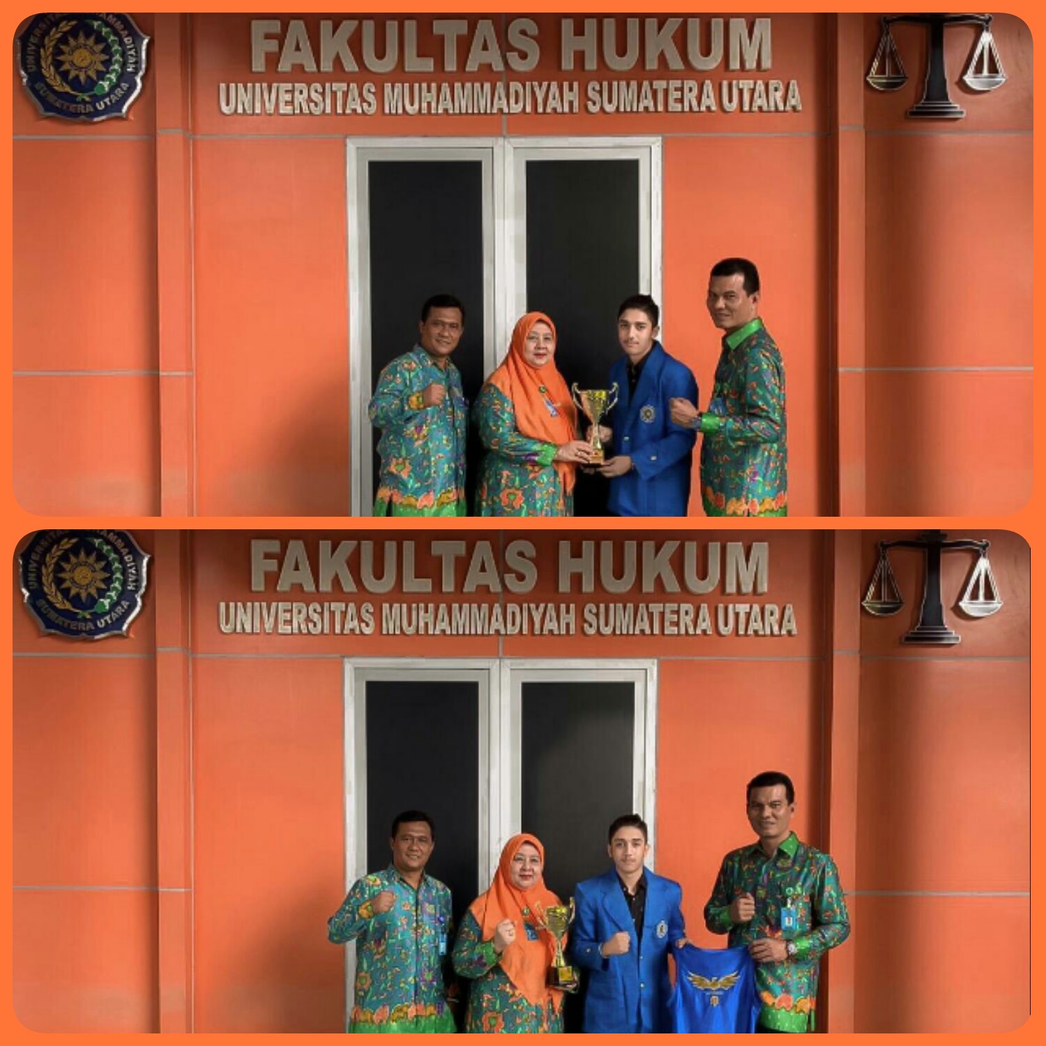 Photo Bersama Pimpinan Fakultas Hukum UMSU sekaligus Penyerahan Piala kepada Ibu Dekan Dr. Ida Hanifah, SH., MH, didampingi oleh Wakil Dekan I, Faisal, SH., M.Hum dan Wakil Dekan III, Zainuddin, SH., MH dengan Juara I Internasional Open Championship adalah Mahasiswa Fakultas Hukum UMSU Atlit Wushu Malik Al Asytar dalam Kompetisi Internasional di Johor Bahru, Malaysia 27-28 april 2019. Medan Jum’at 01/11/2019.