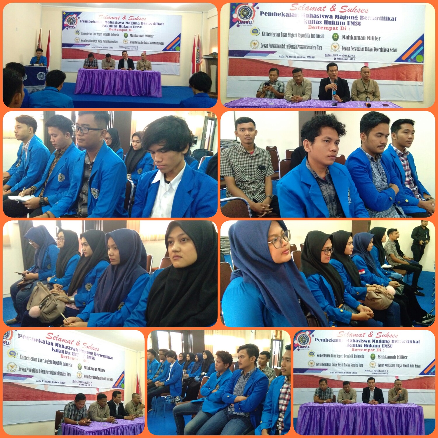 Fakultas Hukum UMSU mengadakan acara pemberian materi bagi mahasiswa peserta magang bersertifikat yang akan dilaksanakan di Kementerian Luar Negeri, Makamah Militer, Dewan Perwakilan Rakyat Daerah Provinsi Sumatera Utara, Dewan Perwakilan Rakyat Daerah Kota Medan, dibuka langsung oleh Wakil Dekan-I (Faisal, SH., M.Hum) sekaligus pemberian arahan, bimbingan dan materi. didampingi oleh Ka. Bagian: Rachmad Abduh, SH., MH, Fajaruddin, SH., MH, Faisal Riza, SH., MH dan Mhd. Teguh Syuhada Lubis, SH., MH. Medan Aula Fakultas Hukum Sabtu 23 November 2019.