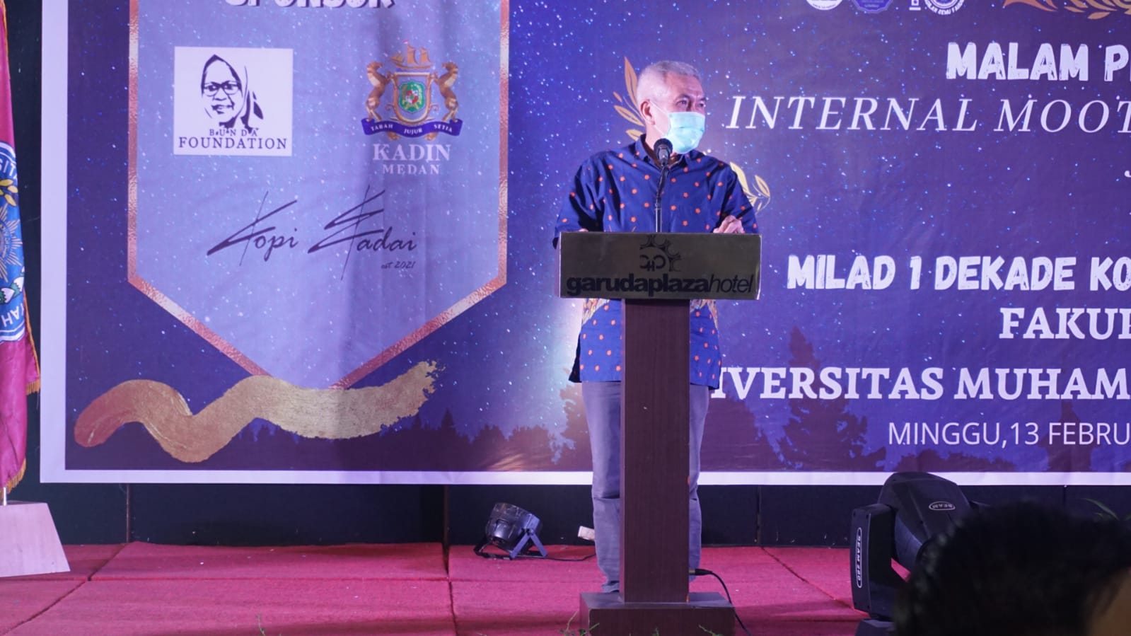Malam Penganugerahan IMCC jilid V sekaligus Milad 1 Dekade KPS FH UMSU ini dihadiri Wakil Rektor I Prof. Dr. Muhammad Arifin Gultom, SH., M.Hum., Wakil Dekan I Bidang Akademik Dr. Zainuddin, SH., M.H., dan Wakil Dekan III Bidang Kemahasiswaan Atikah Rahmi, SH., MH., Pembina KPS FH UMSU Benito Ashdie Kodiyat MS, SH., MH., serta para alumni KPS FH UMSU yang telah hadir untuk turut memeriahkan acara penganugerahan IMCC jilid V sekaligus Milad 1 Dekade KPS FH UMSU.